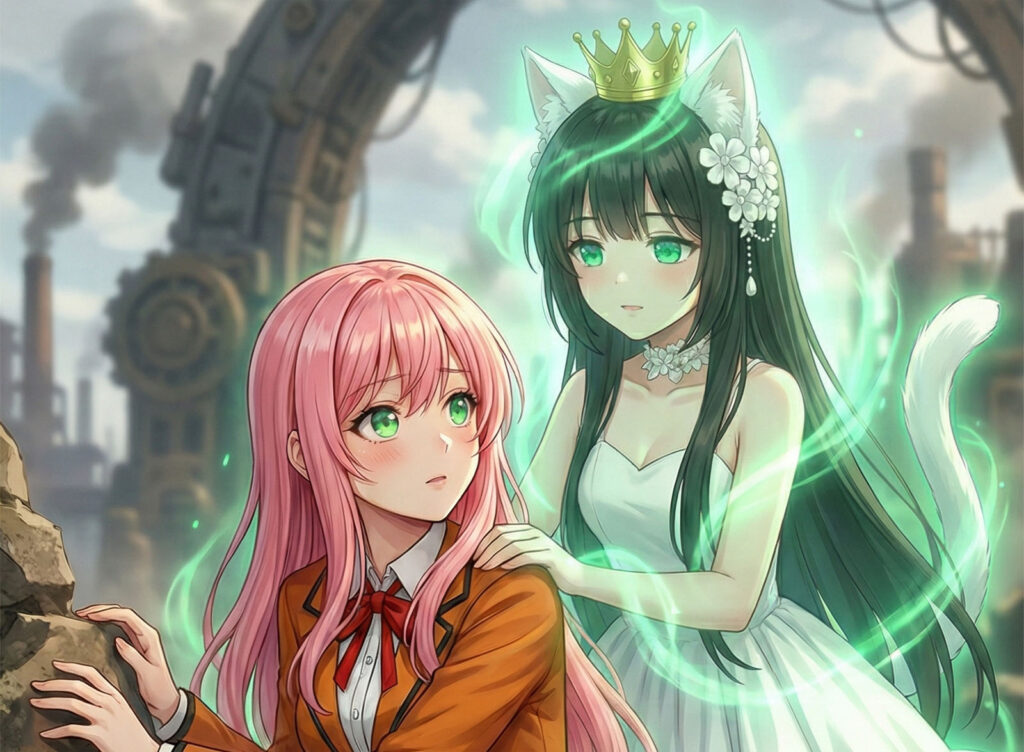 背後からかけられた涼やかな声に、ねねは思わず肩を跳ねさせた。振り返ると、そこには不思議な雰囲気を持った少女が立っていた。淡い光を放つような装束を纏い、その瞳にはどこかすべてを見透かしているような静かな知性が宿っている。