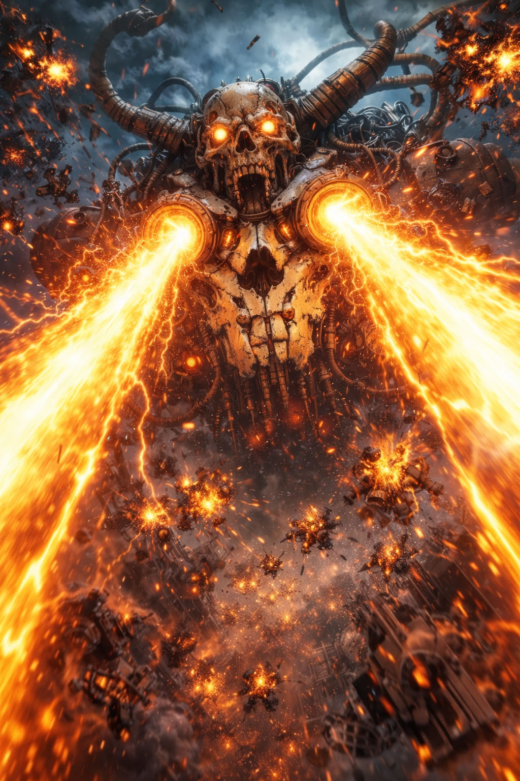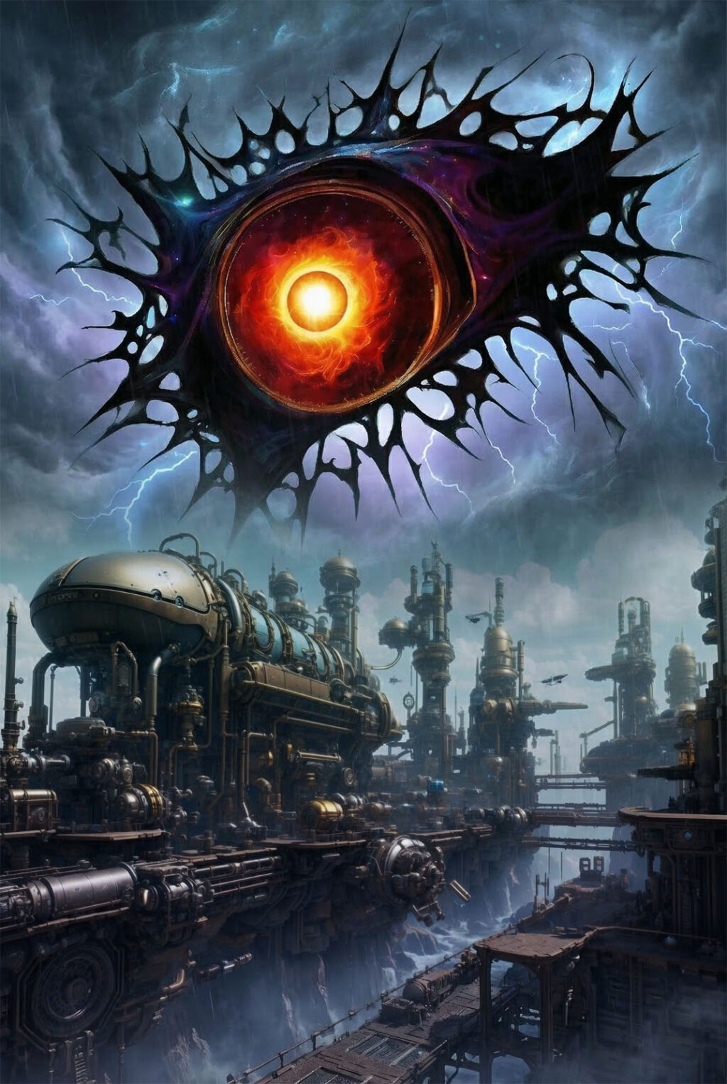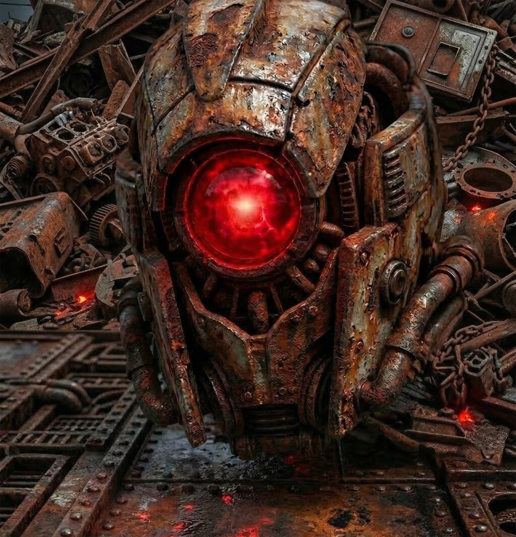 エリアG-16の中心地。昼時とは思えぬ暗黒の嵐が渦巻き、金属の匂いが鼻を突く。 その頂点に鎮座するのは、巨大な『瞳』——デスサイト。冷徹な紅いレンズが、二人を射貫く。