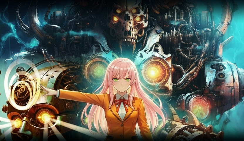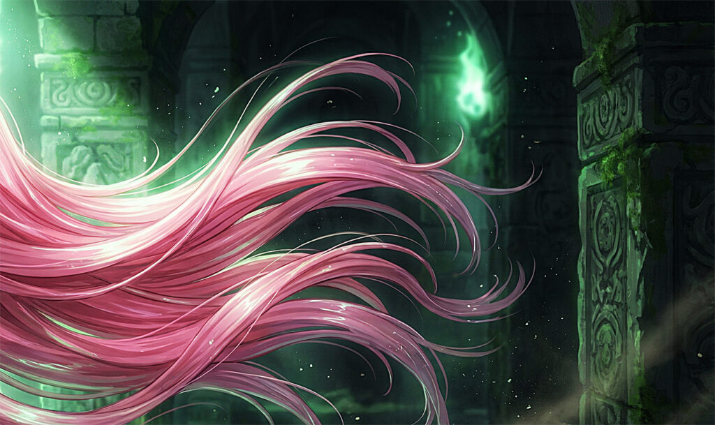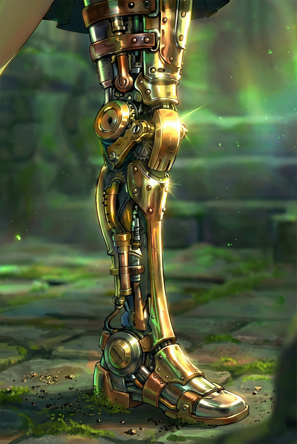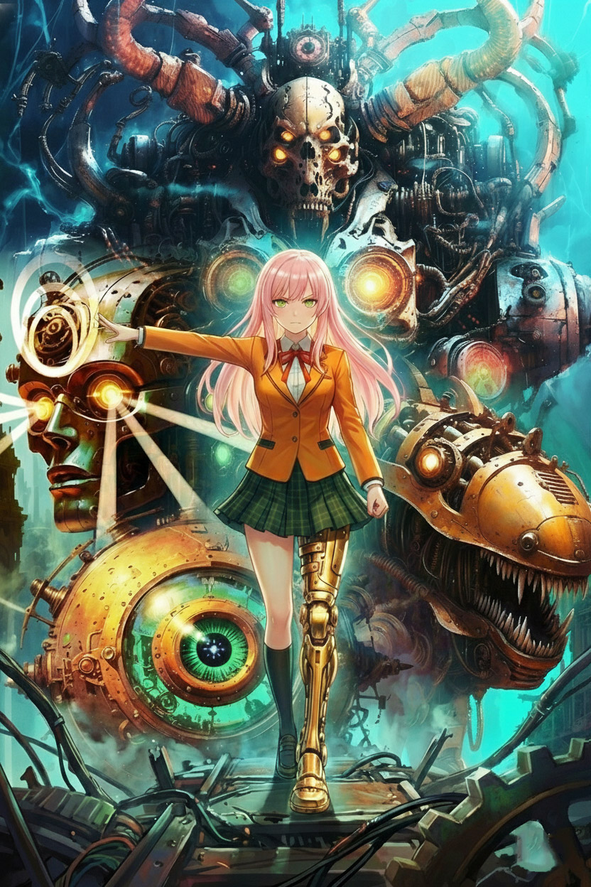 ピンク色の髪が、薄暗い遺跡の中で切なく揺れる。 その歩みは少し奇妙だった。カシャン、カシャンと、硬質な機械音が響く。左足が、無機質な鋼鉄の義足に変わっていたからだ。