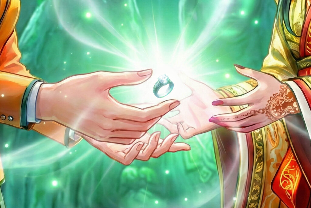 紅姫が祭壇に上がり、ねねがその横に立つ。 二人が同時に手をかざすと、指輪の輝きが優しく脈動した。闇を払う意志、世界を救う覚悟。二人の魂に共鳴し、指輪はふわりと台座から浮き上がった。