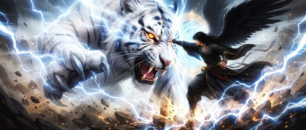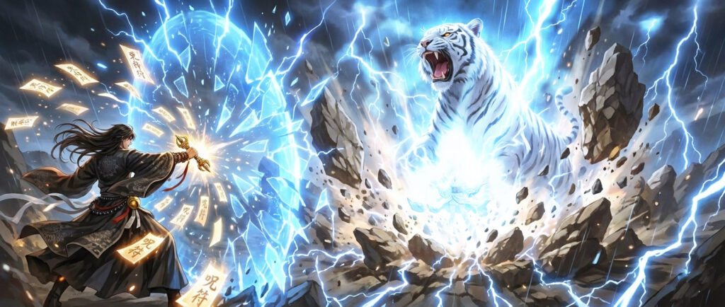 彼を中心に展開された術式が、白虎の放つ無秩序な雷を一点に集約し、地面へと流していく。 白虎は苛立ち、巨大な爪で月影を引き裂こうと襲いかかる。その速度は雷光そのもの。 しかし月影は、紙一重でそれを躱し、逆に白虎の懐へと飛び込んだ。