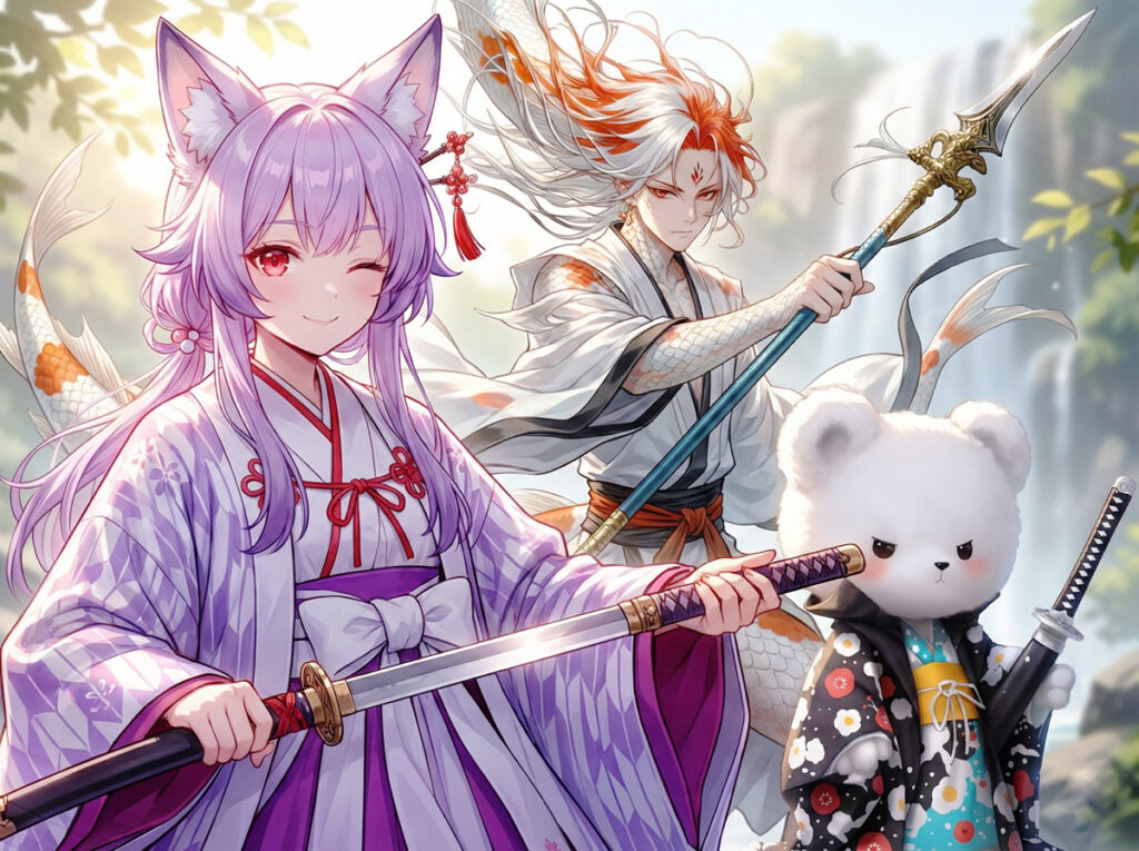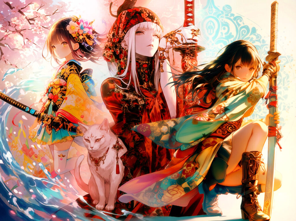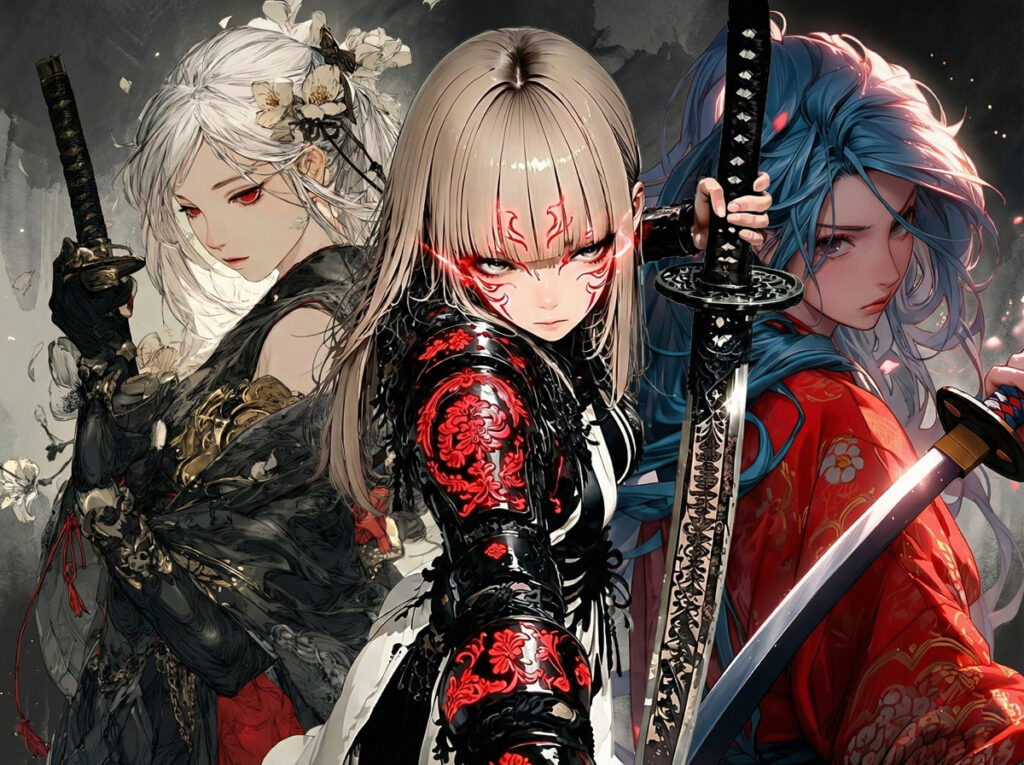 白刀衆を率いる美しい3人の将軍:白兎(ハクト)・是音(ゼオン)・桜花(オウカ)。