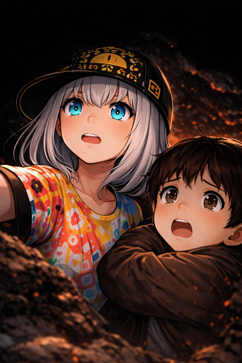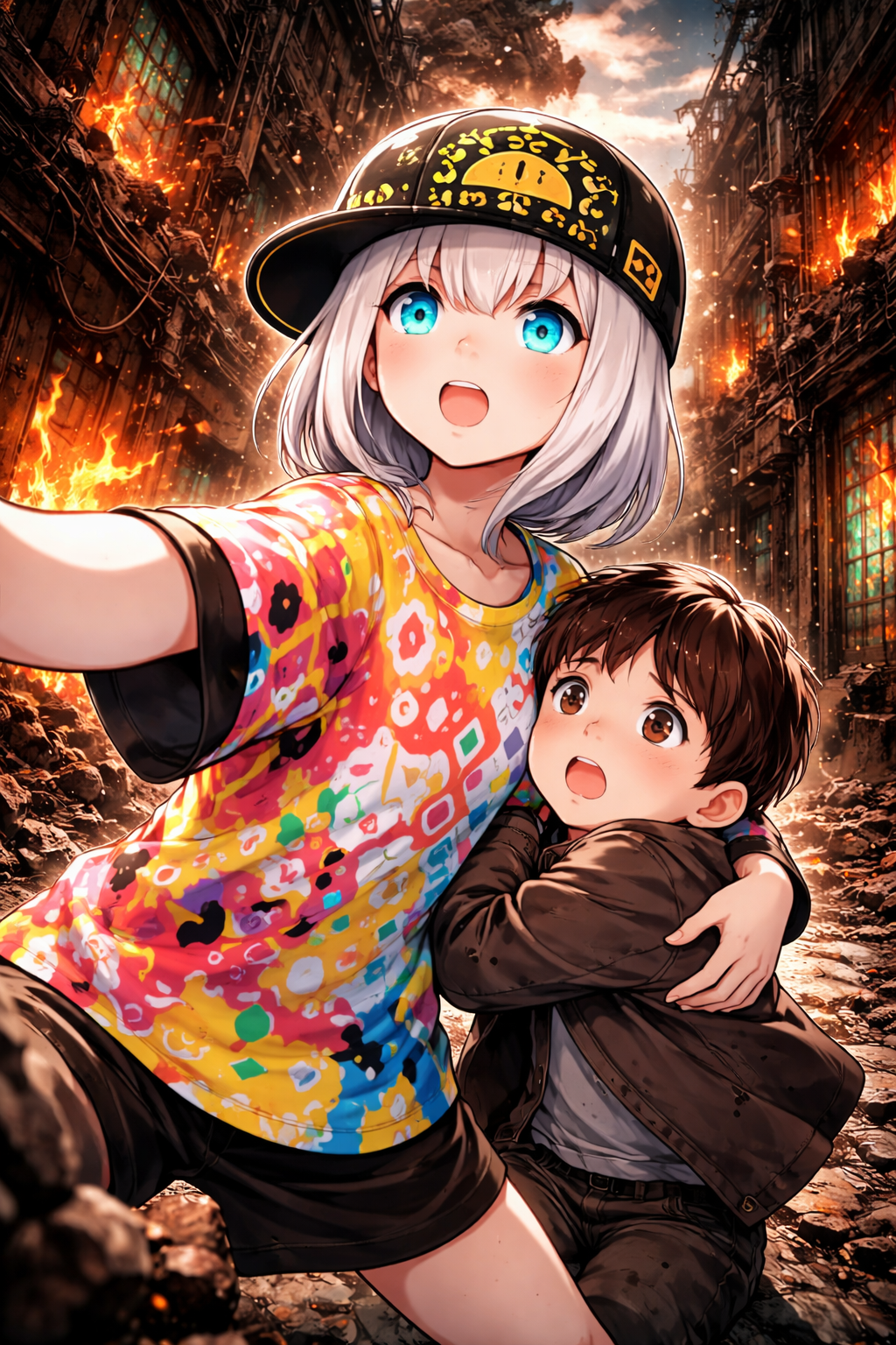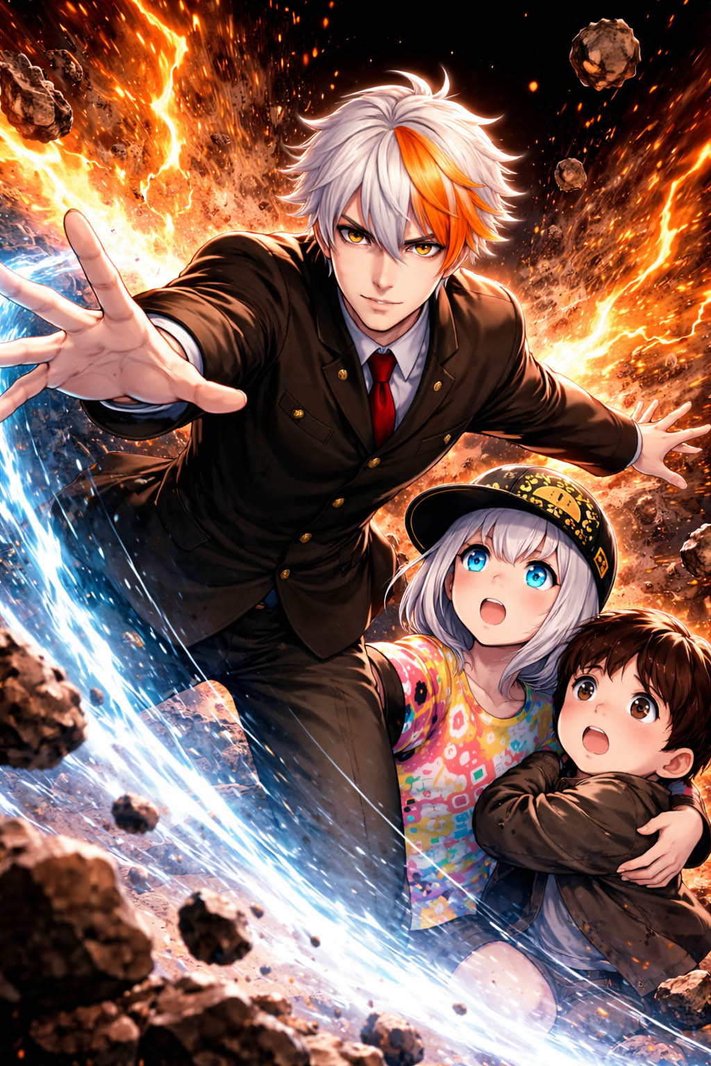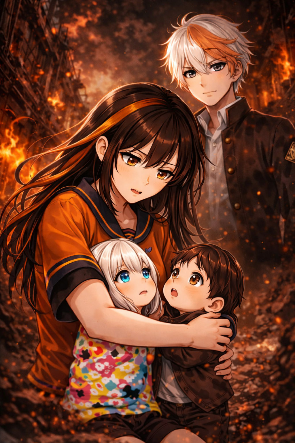 アカリは武器を下ろし、震える子供たちを強く、優しく抱きしめた。その横で、ハクが迅速に傷ついた街の人の救助を始める。