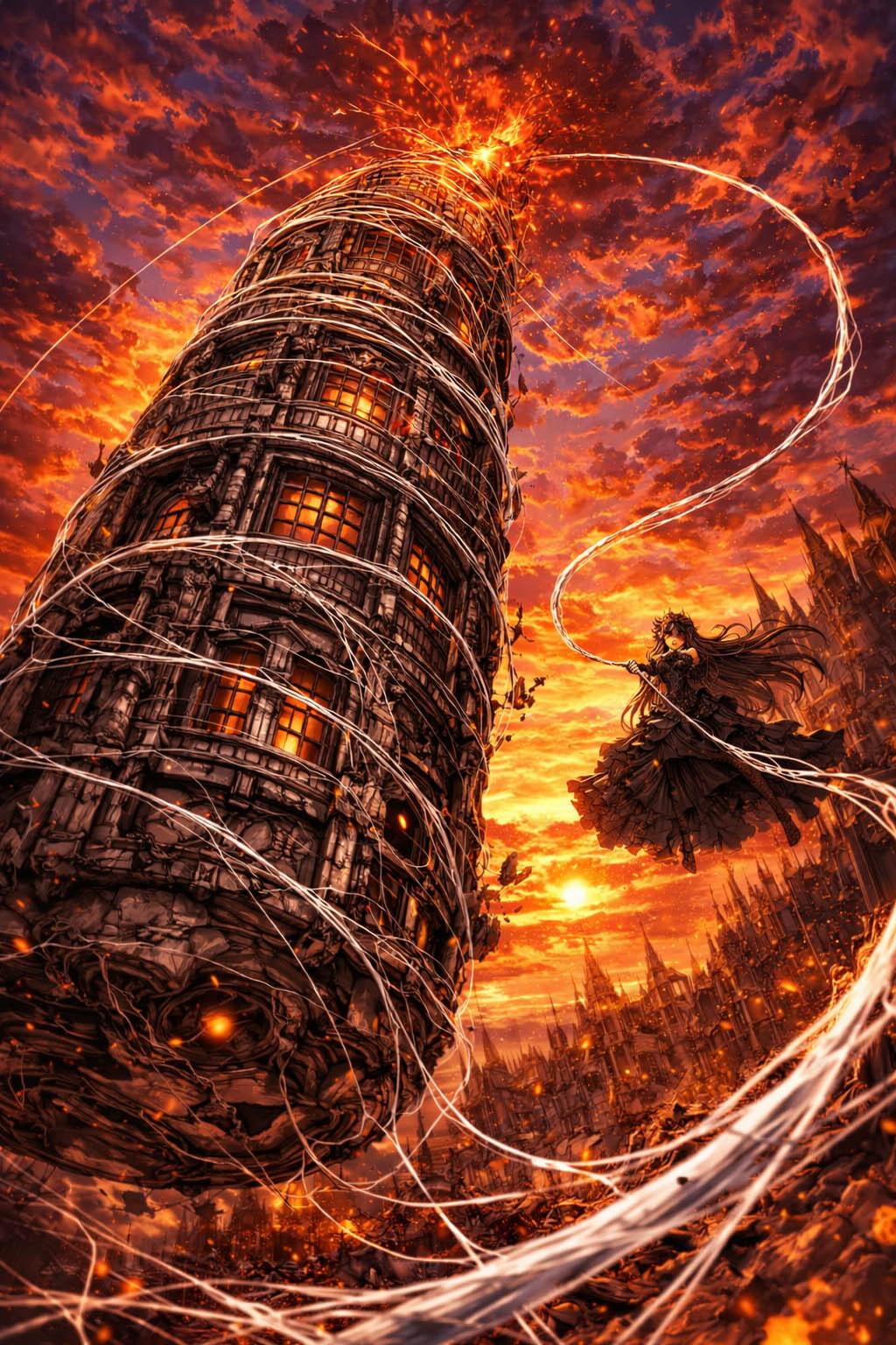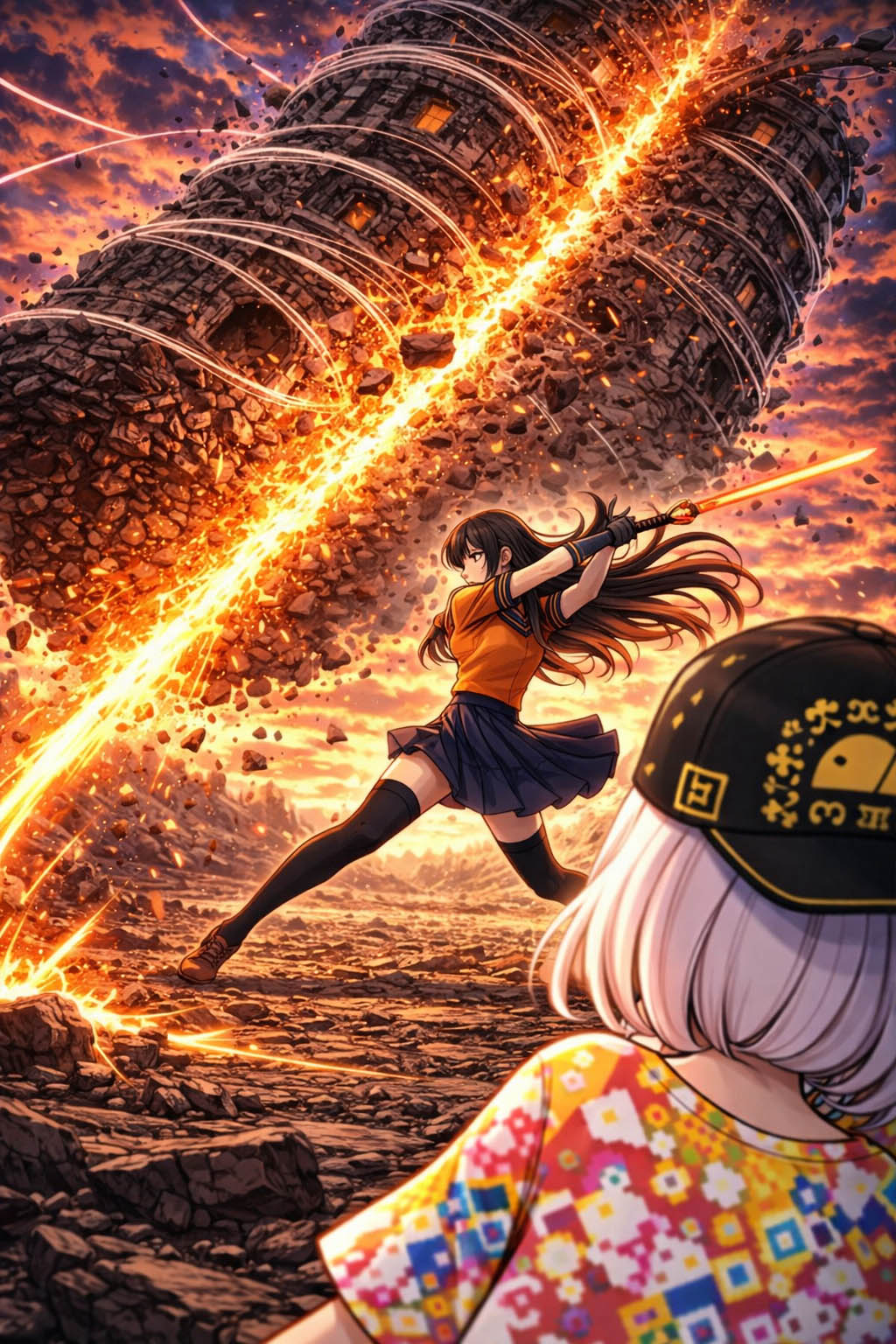 蜘蛛の糸で縛られた塔を振り回すアラクネ。巨大な建造物がノゾミと幼い子供に襲い掛かかった。