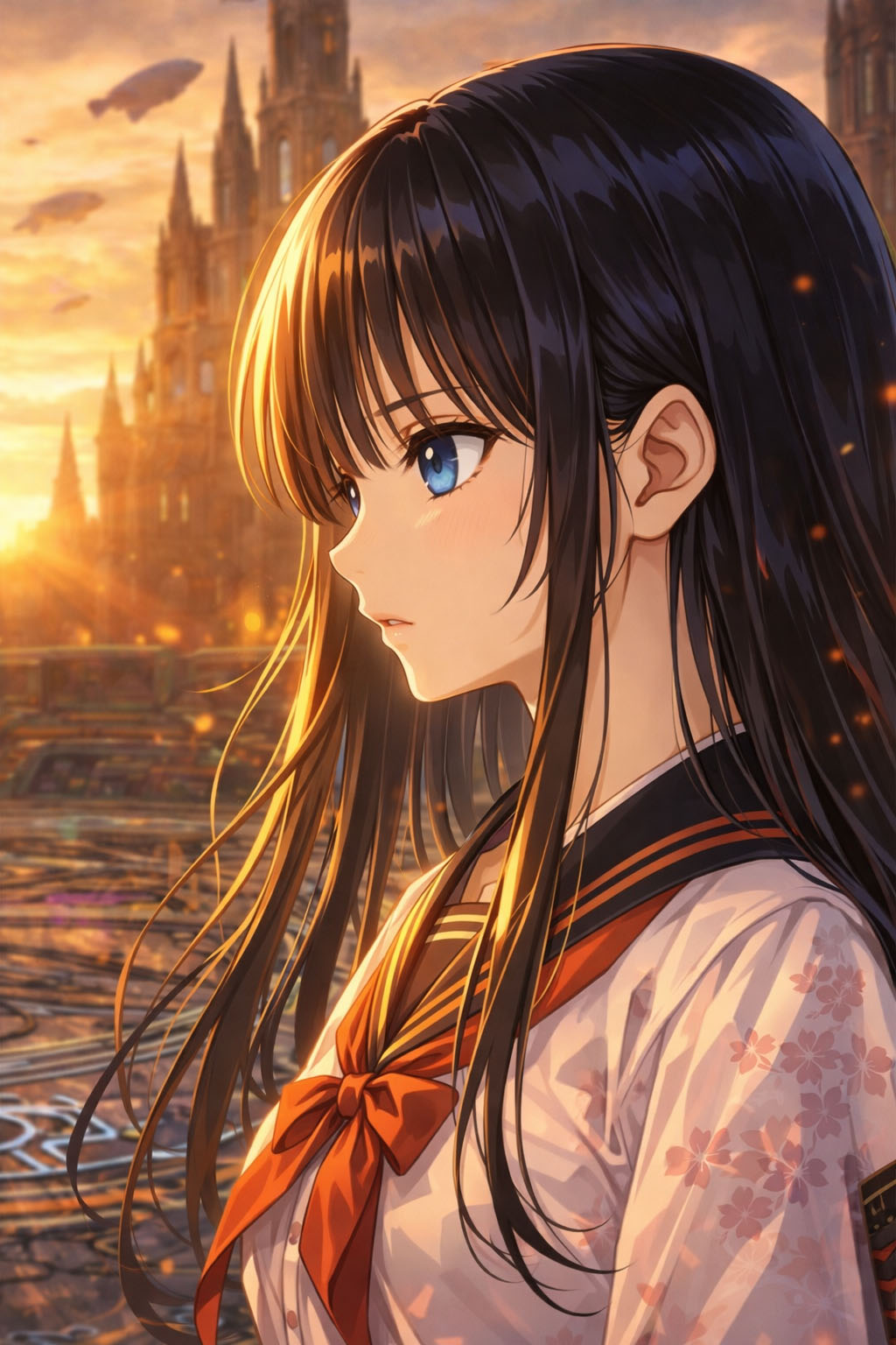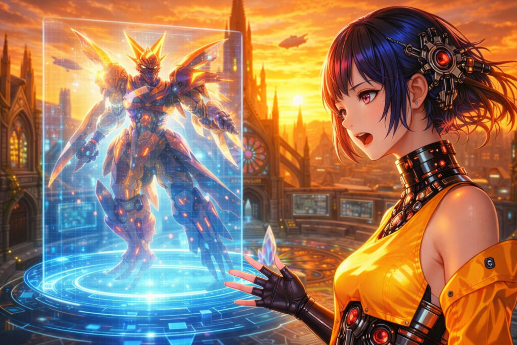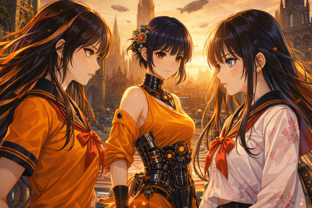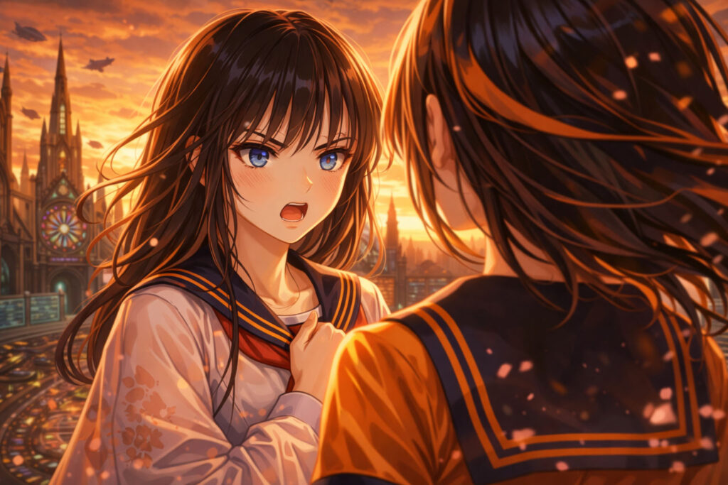 白く磨かれた床に、幾何学的な光のラインが走るその空間で、アカリとアレッサ、そして転校生の桜花(おうか)が向かい合っていた。