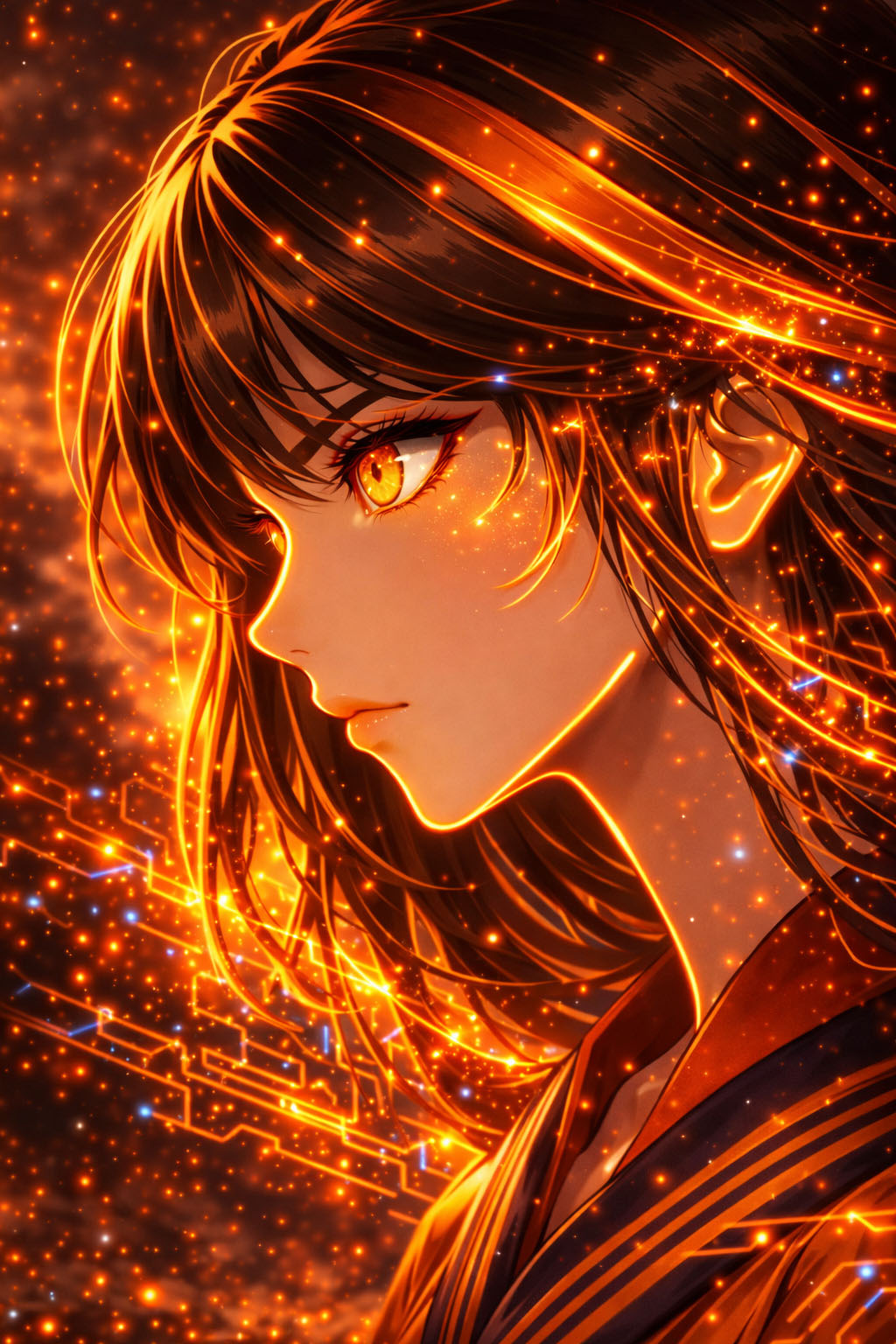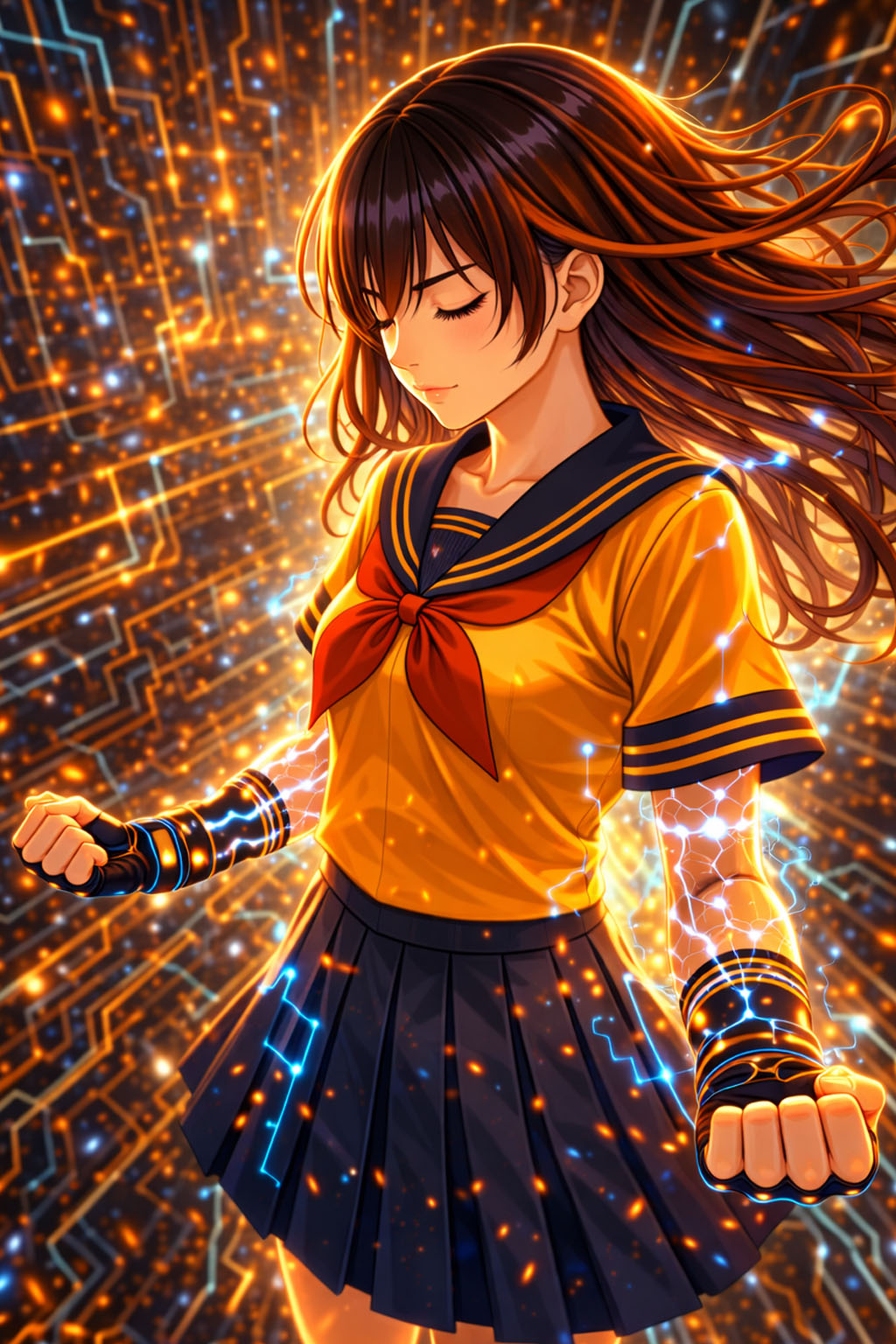 それは電子回路のような光の線となり、彼女を中心に渦を巻く。