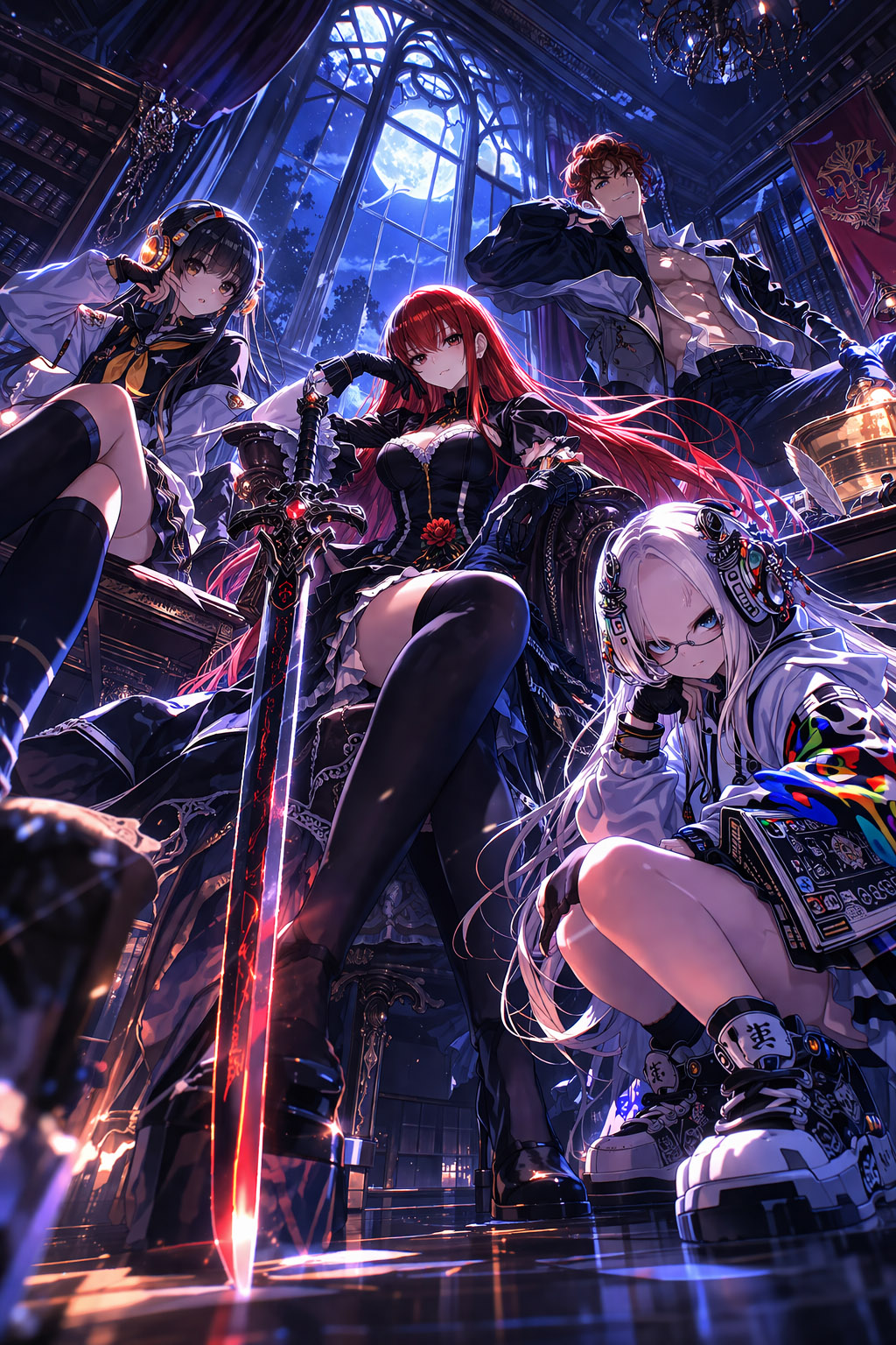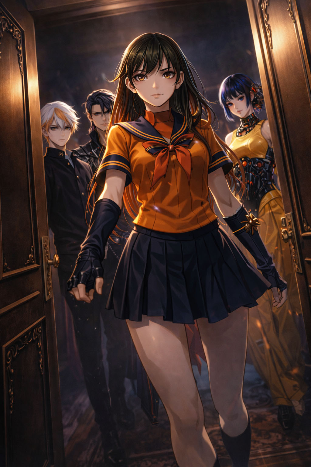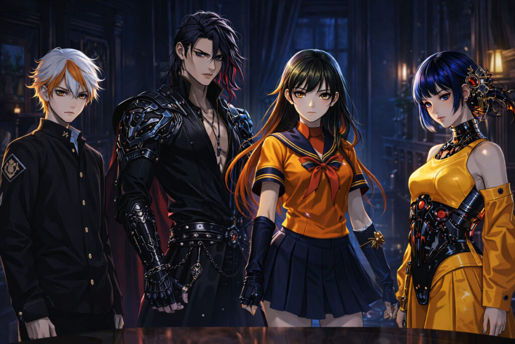 ネオライズ防衛の要である主将クラスの生徒たち。制服姿のまま駆けつけたアカリ、ハク、ウルフ、アレッサ。