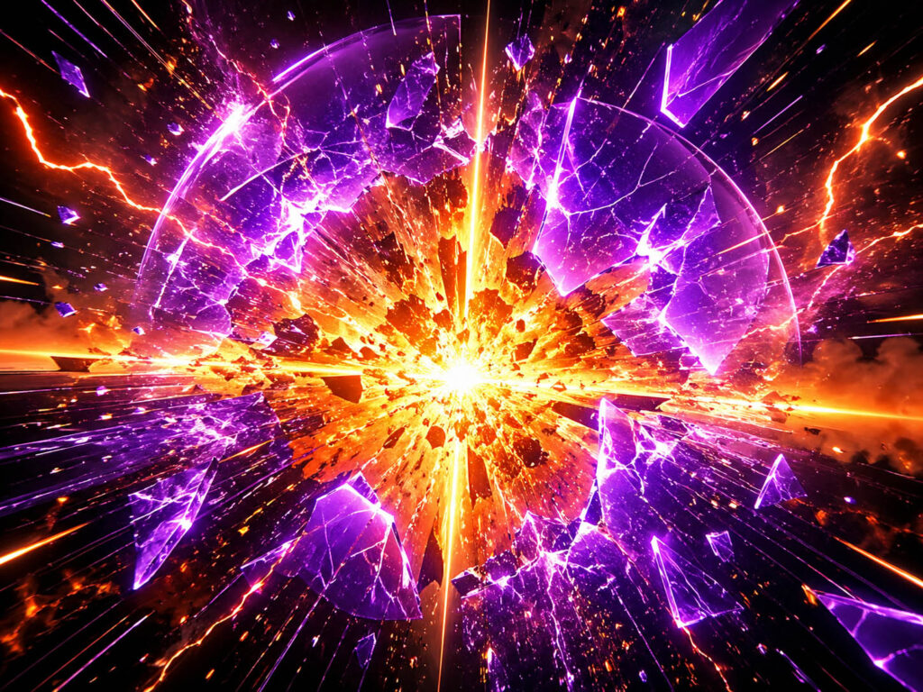 オリジンは避ける素振りすら見せず、不敵な笑みを浮かべた。彼の幾重にも重ねられた防御障壁がアカリの渾身の一撃を真正面から受け止め砕けた。