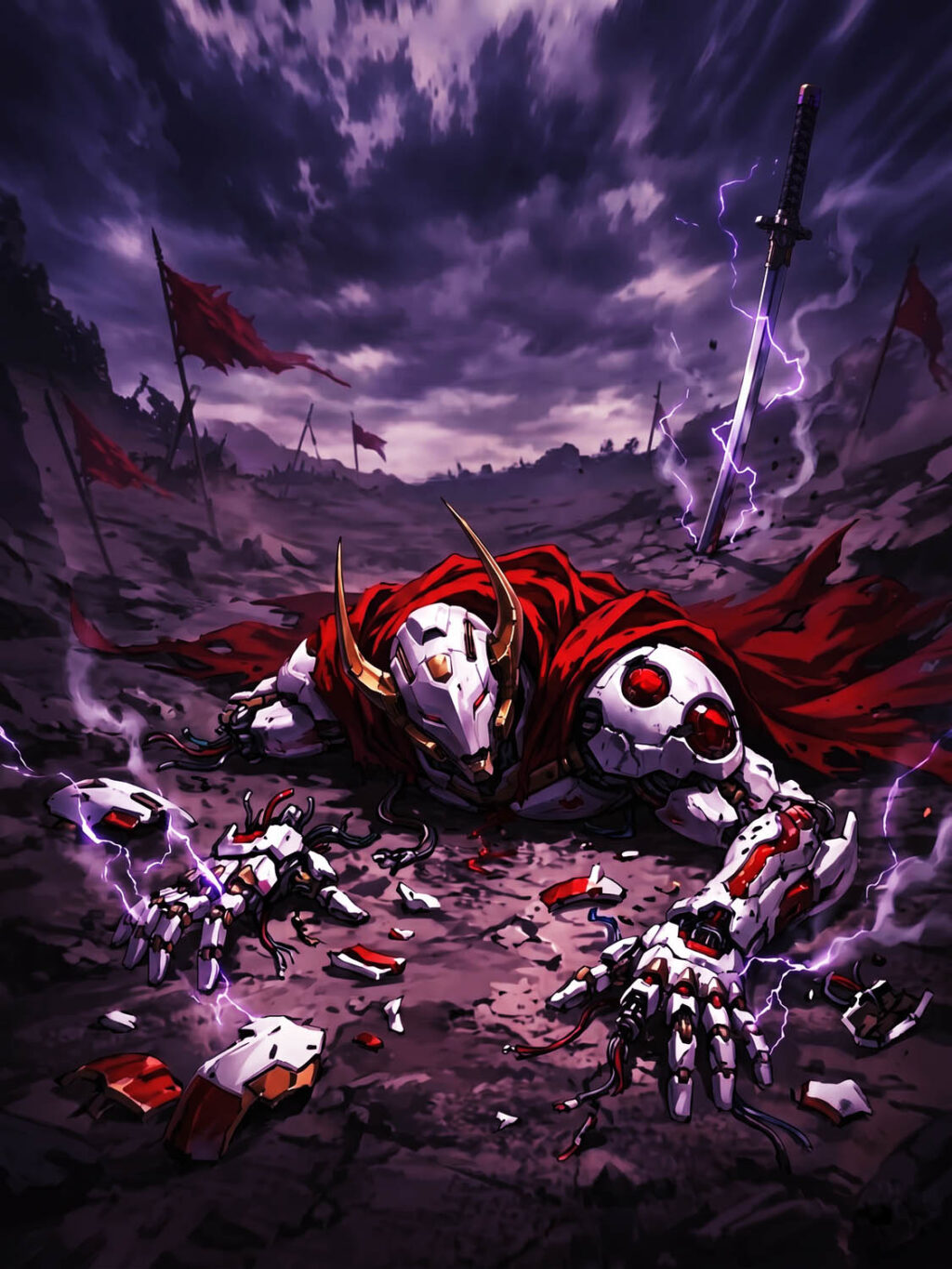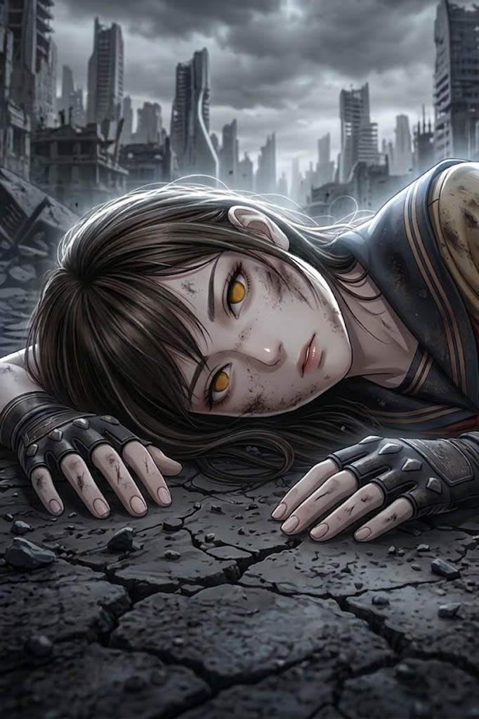 崩れ落ち消えていく機神、地に落ち倒れるアカリ。打撃を正面から受け、指一本動かすことも叶わない。倒れた彼女の瞳はうつろに漂っていた。